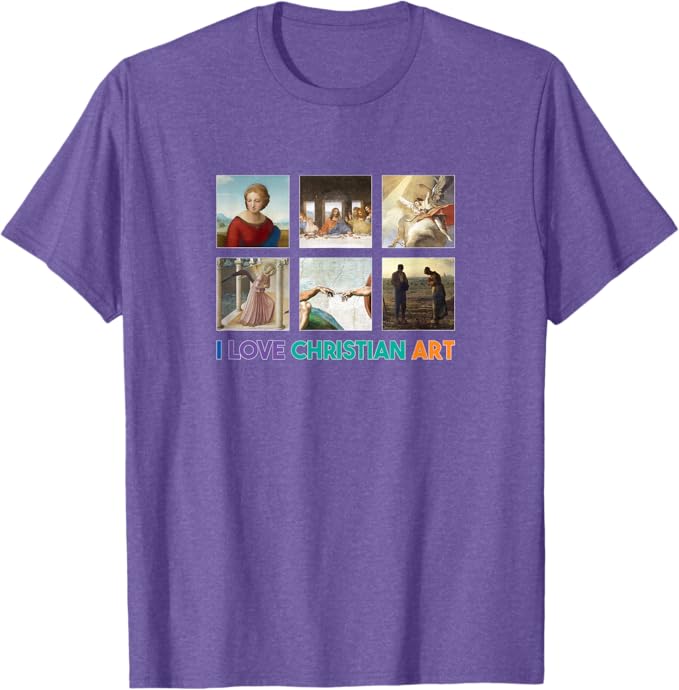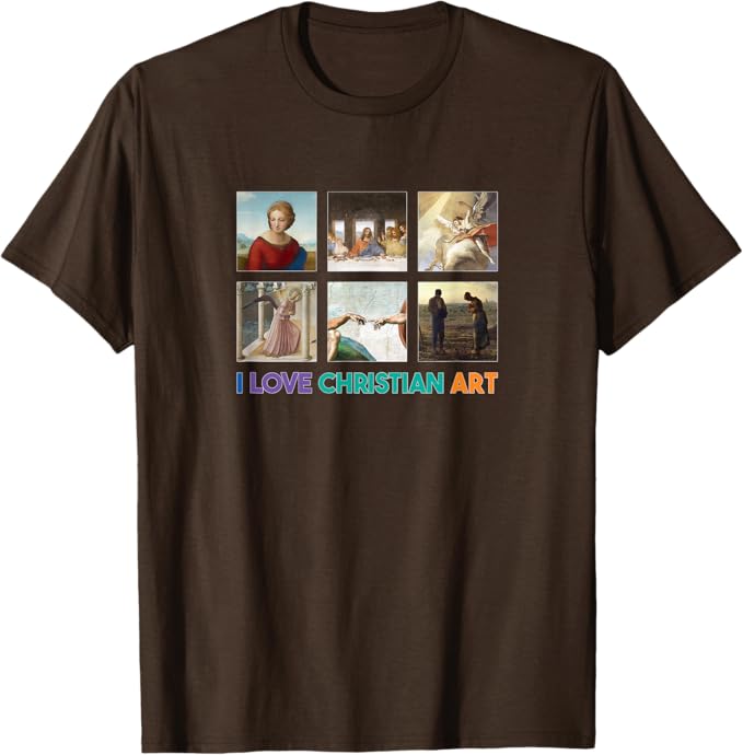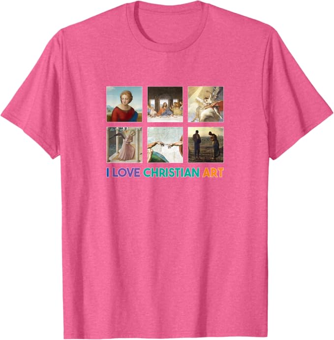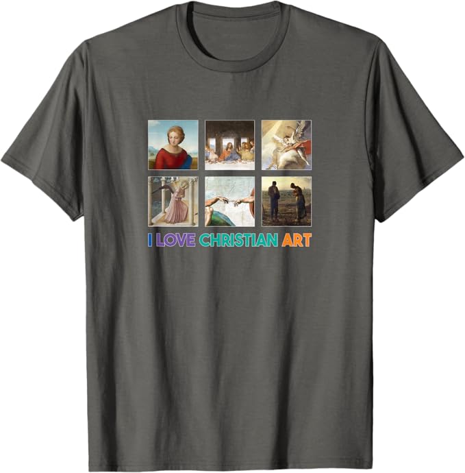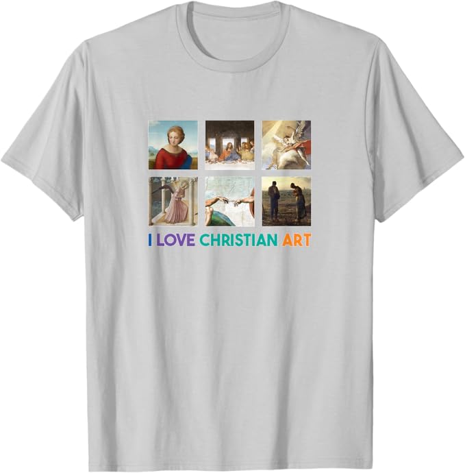 Celebrate your passion for Christian art with this vibrant and uplifting design that proclaims “I LOVE CHRISTIAN ART” in joyful, multicolored lettering. Surrounded by six timeless masterpieces of religious art, this creation beautifully captures the profound spirituality, artistic brilliance, and enduring inspiration of works that have touched hearts for centuries. These iconic pieces include The Last Supper by Leonardo da Vinci, The Annunciation by Fra Angelico, The Sacrifice of Isaac by Tiepolo, Madonna of the Meadow by Raphael, The Creation of Adam by Michelangelo, and The Angelus by Jean-François Millet, each evoking deep faith, serenity, and wonder